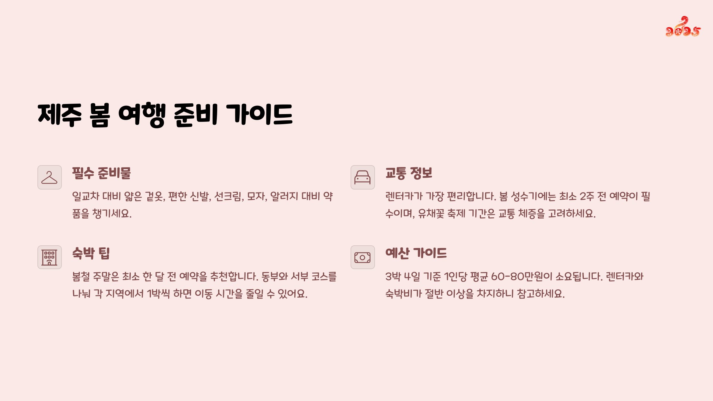봄철 제주도는 렌터카가 가장 편리합니다. 대중교통도 가능하지만, 주요 여행지는 차량 이동이 훨씬 수월해요. 특히 새벽 일출이나 일몰을 보려면 렌터카 이용을 추천드립니다.