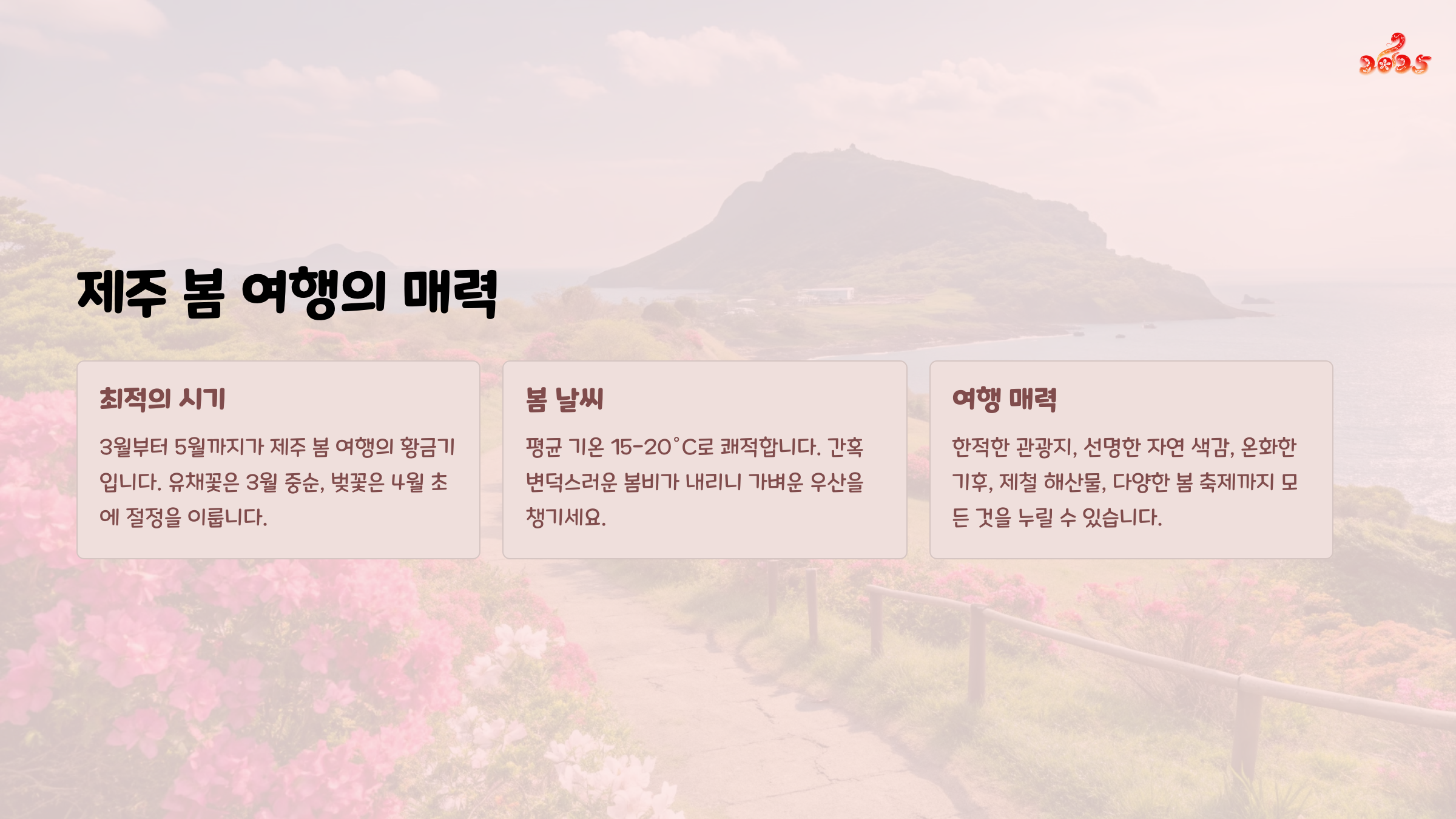 이번 봄, 바쁜 일상에서 벗어나 제주도 봄 여행으로 나만의 힐링 코스를 찾아보세요.🌿