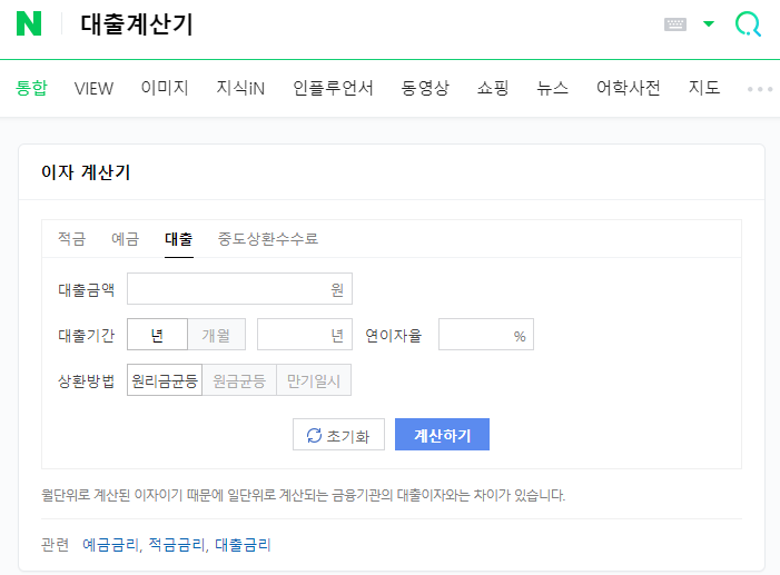 네이버에서 대출 계산기를 검색하면 아래와 같이 나타납니다.