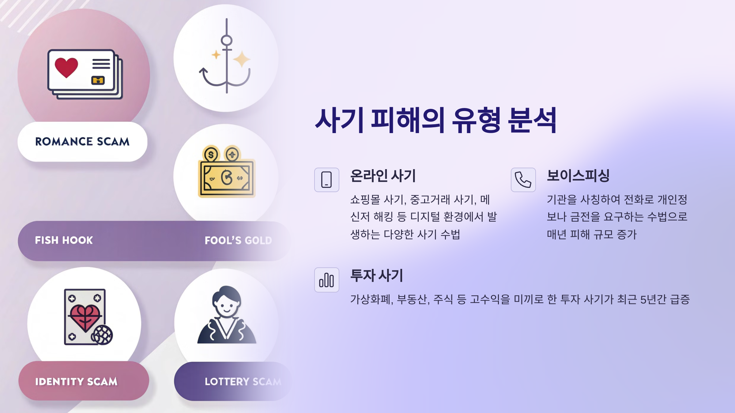 한순간의 방심으로 인한 피해가 장기간 지속되지 않도록, 사기 유형별 특징과 대처법을 숙지하시고 필요할 때 활용하시기 바랍니다.
