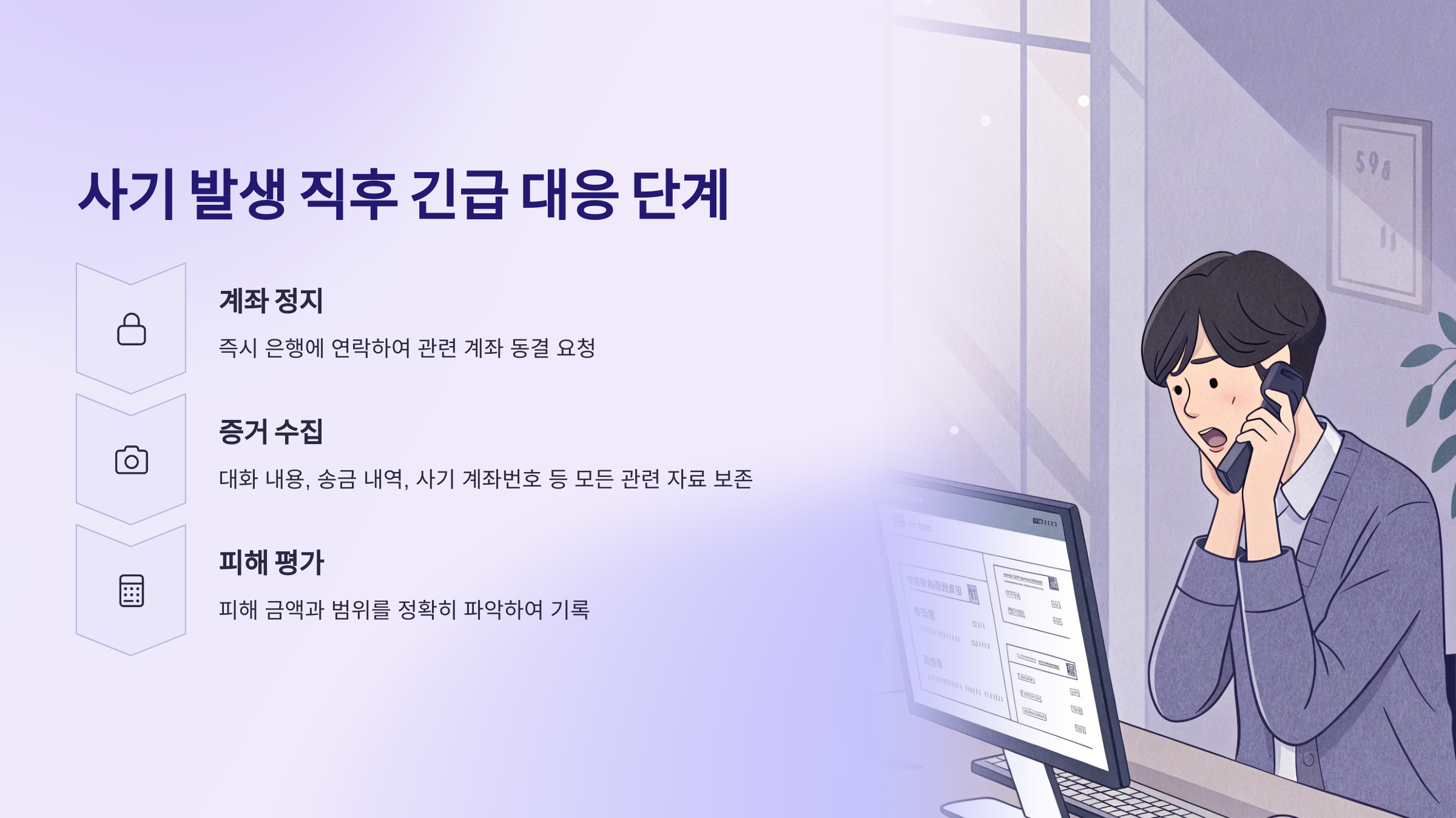 가장 중요한 것은 '신속한 대응'입니다. 피해 사실을 인지했다면 다음 순서대로 행동하세요.