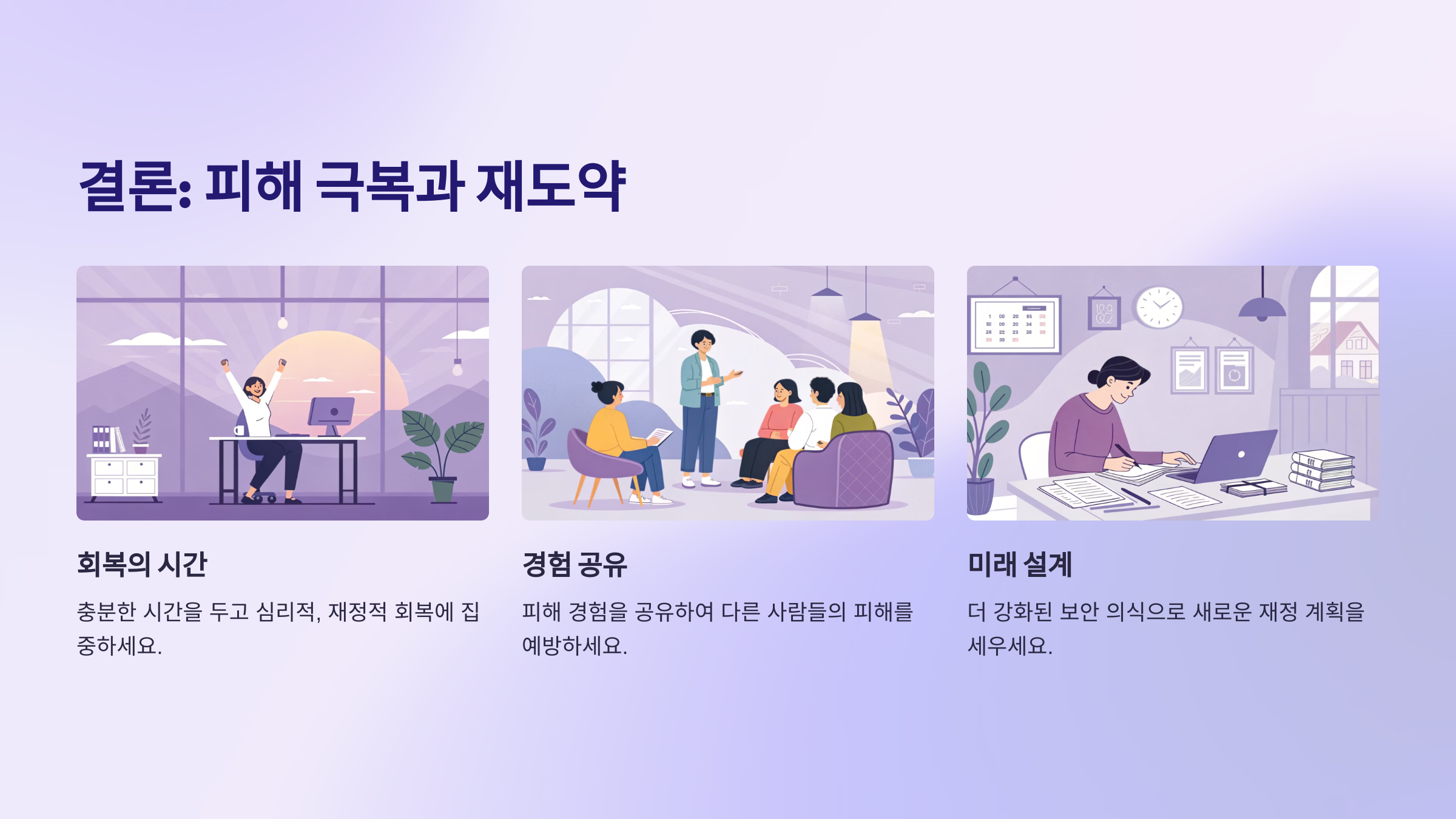 또한, 사기 피해를 당한 후에는 그 경험을 교훈 삼아 앞으로의 사기 예방에 도움이 되는 지식과 경각심을 키우는 것이 중요합니다. 지나친 자책보다는 일상으로 빠르게 복귀하고, 본업에 집중하는 것이 장기적으로 더 나은 선택입니다.