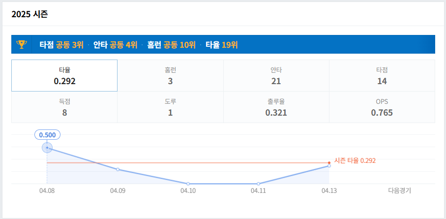 • 최근 10경기: 7경기 안타, 4경기 타점 기록