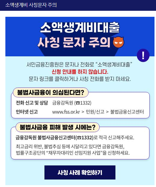 아래와 같이 소액 생계비 사칭 문자에 주의하시기 바랍니다.