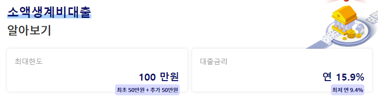중도상환 수수료가 면제되며 대출금리 연 15.9%로 최대 100만 원 한도에서 대출이 진행되고 있습니다.