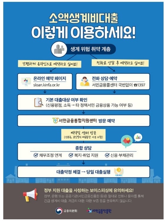 | 센터 방문ㆍ대출상담 시에는 ①신분증, ②대출금 수령용 본인명의 예금통장 사본 필요. 본인명의 예금통장 이용이 어려운 경우 자세한 구비서류는 센터 방문 전에 서민금융콜센터(☎1397) 확인 필요 |