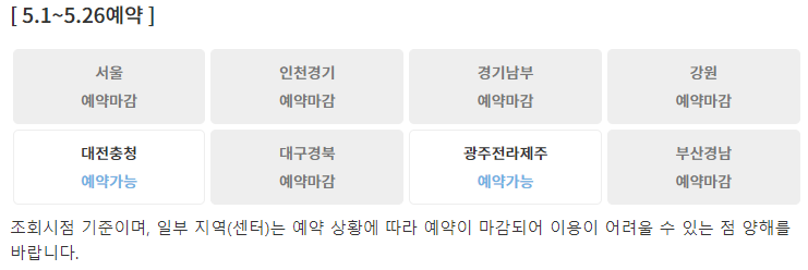 워낙 신청자가 많다 보니 예약 마감이 빠르게 되고 있으며 아래와 같이 대전과 전라제주 지역에 한하여 예약이 가능하다고 합니다.