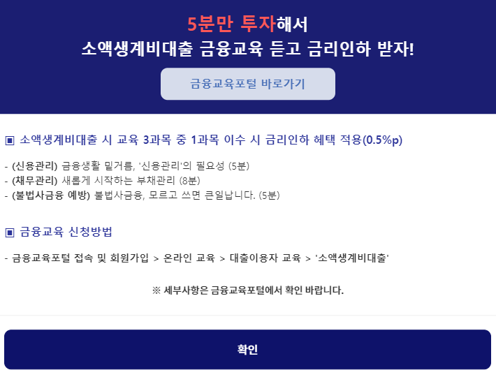 6개월 성실 상환 시 금리 인하로 최종 9.9%가 가능하며 아래 교육을 이수시 0.5% 우대금리가 적용됩니다.
