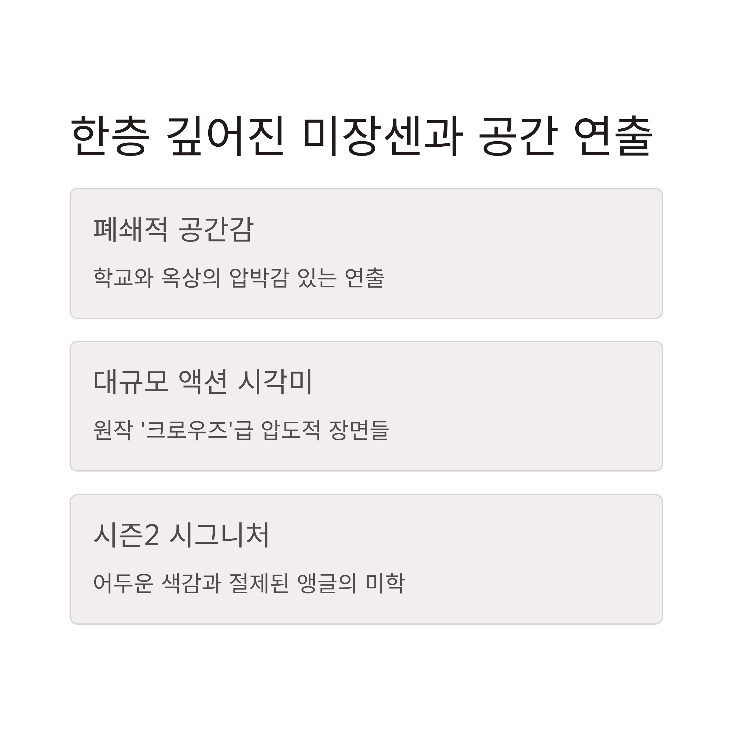 특히 폐쇄적 공간 속에서 느껴지는 심리적 압박감이 시즌2의 분위기를 더욱 묵직하게 만듭니다.