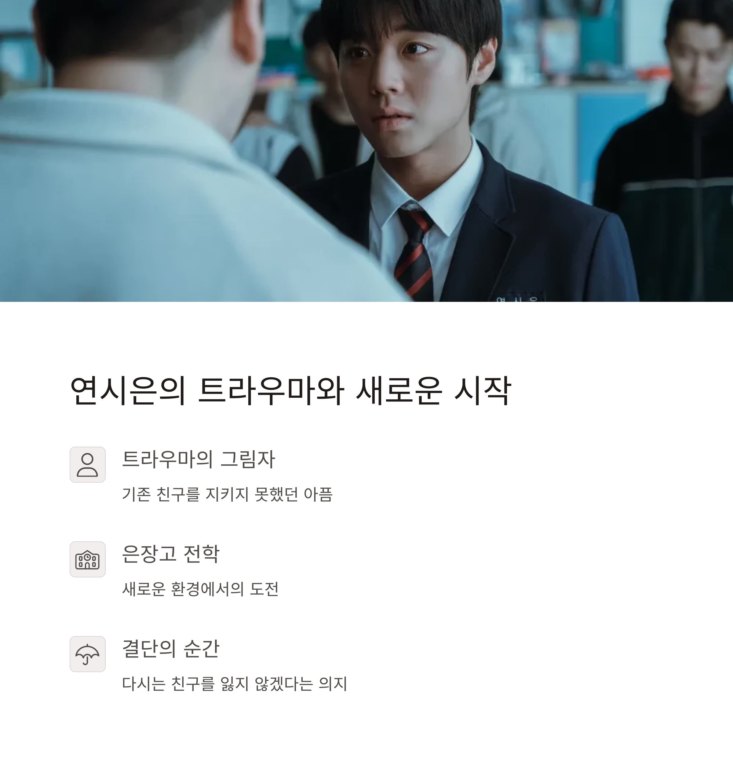 연시은의 전학은 단순한 설정을 넘어, 시즌2 전체를 관통하는 감정선의 출발점이 됩니다.