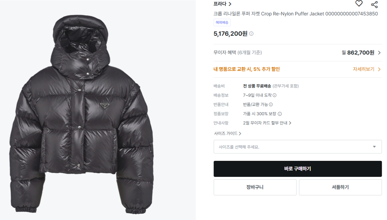 가격: 프라다 공식 한국 웹사이트에서는 해당 제품의 가격이 공개되어 있지 않습니다. 그러나 신세계몰 등 국내 명품 편집숍에서 프라다의 유사한 리나일론 재킷이 약 270만 원에서 375만 원 사이에 판매되고 있습니다.