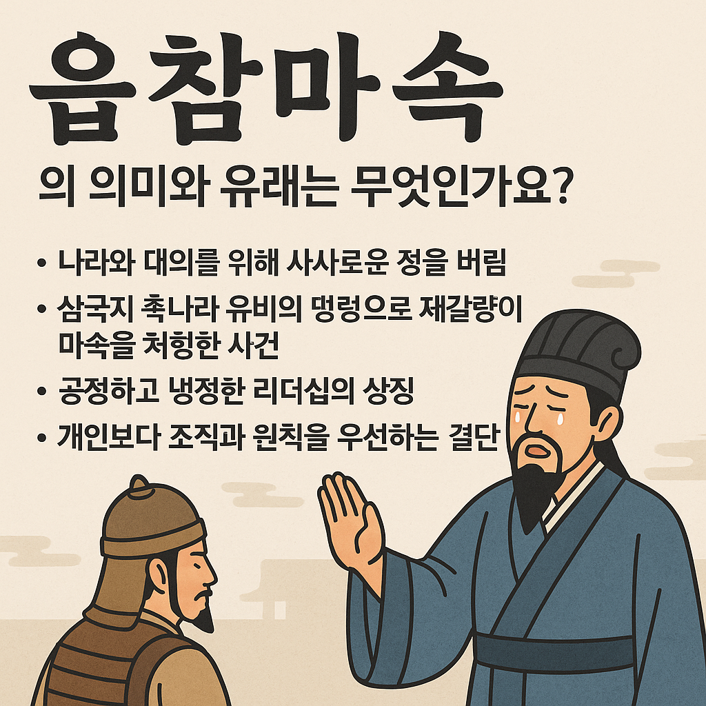 읍참마속은 공익과 대의를 위해 사사로운 정을 버리고 원칙을 지킨 결단을 뜻하는 고사성어로, 삼국지 촉나라 제갈량이 명령을 어긴 마속을 처형한 사건에서 유래합니다.