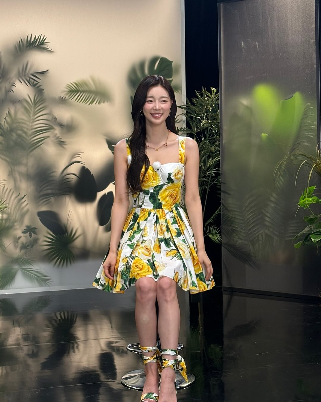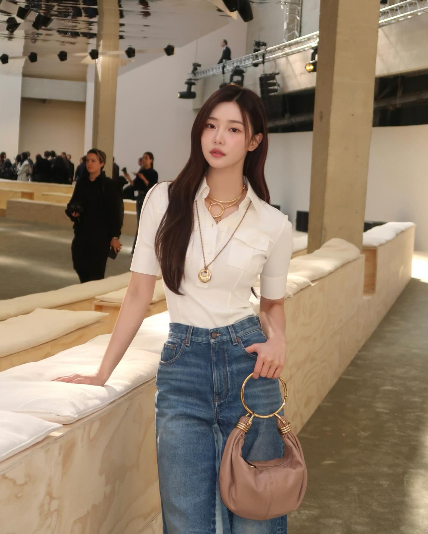 이시안은 청량한 니트 상의와 미니스커트, 은은한 시스루 언더웨어 스타일로 세련되면서도 대담한 룩을 선보였다. 여기에 니삭스, 실버 메리제인 슈즈, 라탄백까지 매치해 트렌디함을 극대화하며 강렬한 인상을 남겼다.