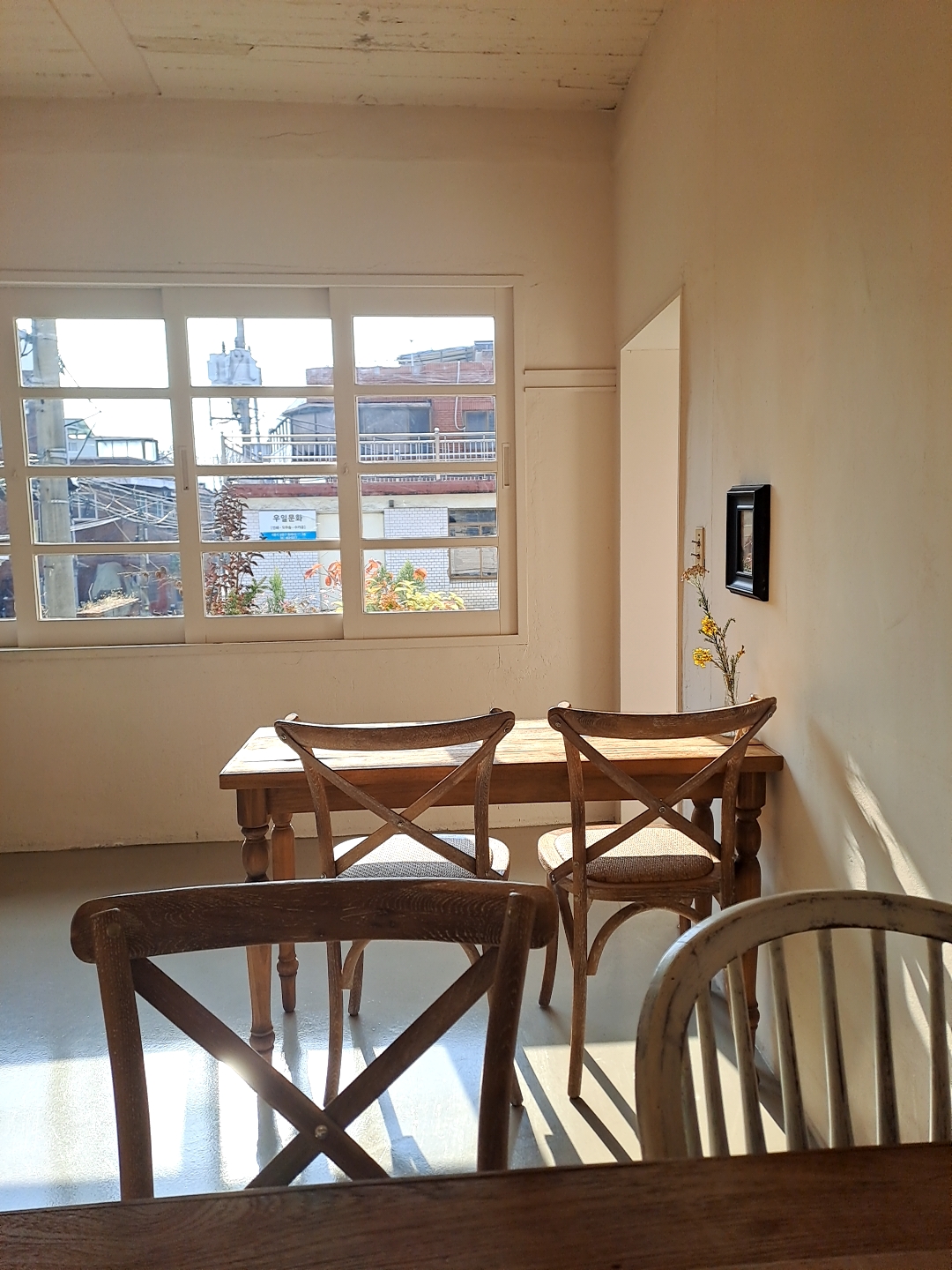 - 미니멀한 인테리어와 자연광이 들어오는 창가 좌석