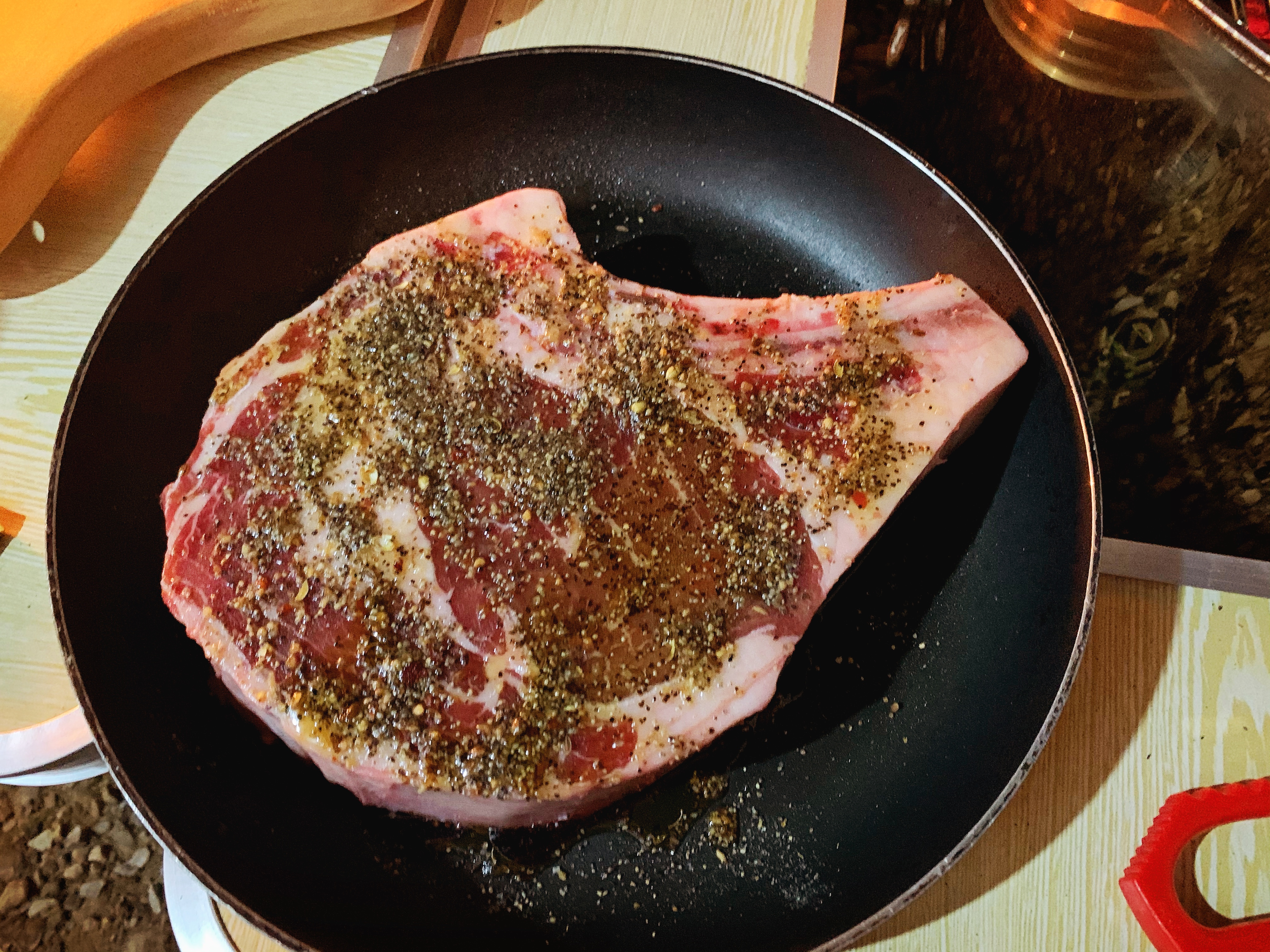- 캠핑용 그리들 또는 팬을 중불로 달군 후 올리브 오일을 두릅니다.