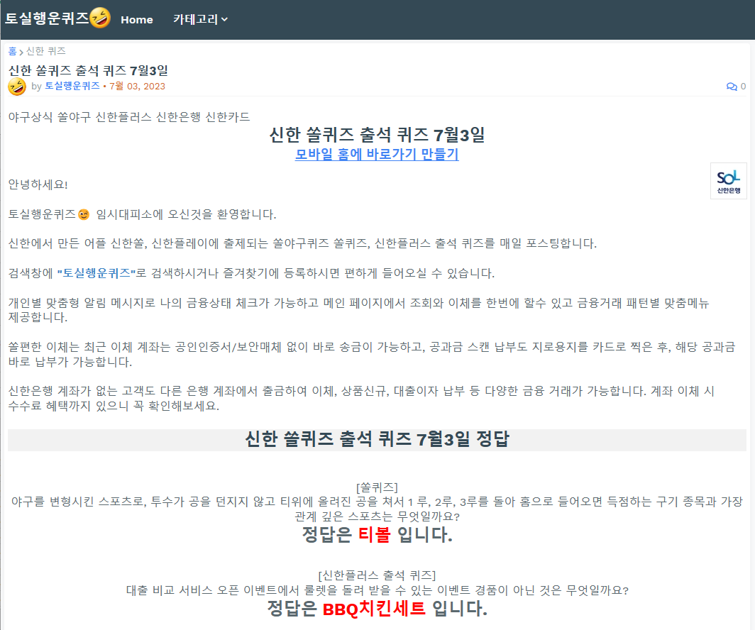 이렇게 퀴즈를 들어가 보면 쏠퀴즈와 신한플러스 출석 퀴즈의 정답이 이렇게 나옵니다.