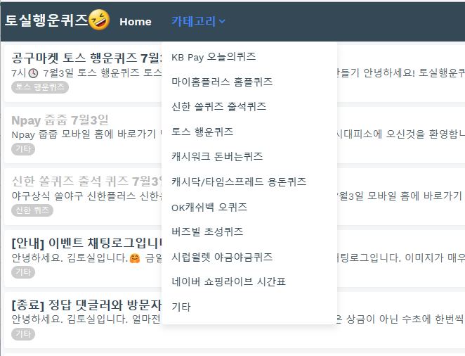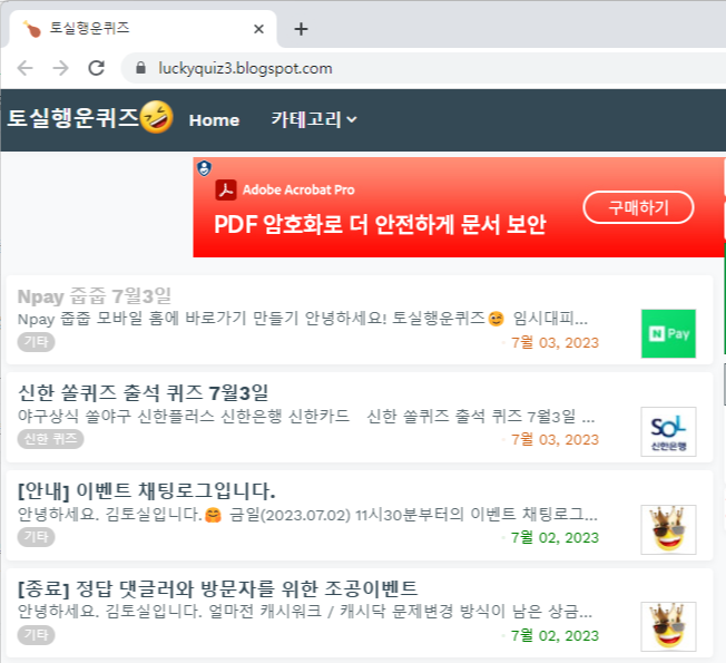 퀴즈들이 어려운 것은 아니지만 좀 더 빠르고 정확하게 확인하고자 토실행운퀴즈를 이용해 보시면 좋을 거 같네요
