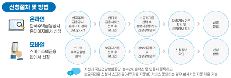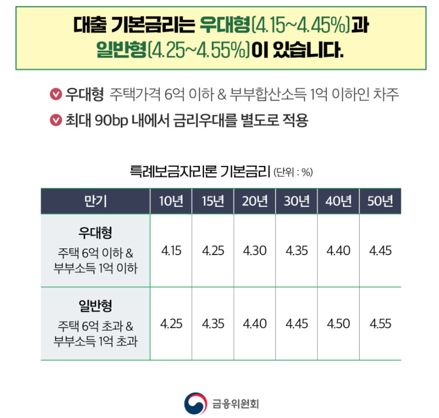 대출 금리는 차주 특성별로 우대형과 일반형으로 구분돼 적용되는데, 주택가격 6억 원 이하면서 부부 합산 소득이 1억 원 이하인 경우는 우대형 금리인 4.65〜4.95%를 적용받고, 나머지는 4.75〜5.05%의 일반형 금리를 이용할 수 있다.