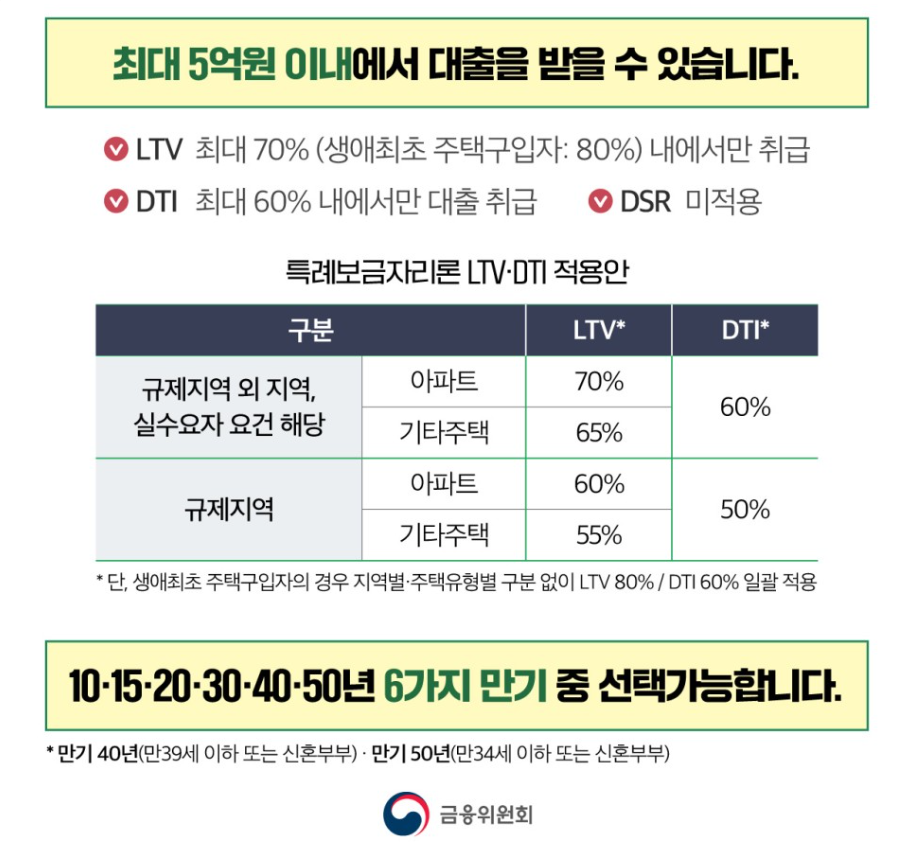 만기는 10·15·20·30·40년(만 39세 이하 또는 신혼부부)·50년(만 34세 이하 또는 신혼부부) 등 6가지 상품 가운데 고를 수 있으며, 대출 기간 내에 매년 1주택 유지 요건을 점검한다. 주택담보대출비율(LTV)과 총부채상환비율(DTI)은 기존 보금자리론과 마찬가지로 각각 70%(생애 최초 구매자 80%)와 60%가 적용되지만 총부채원리금사오한비율(DSR)은 적용되지 않는다.