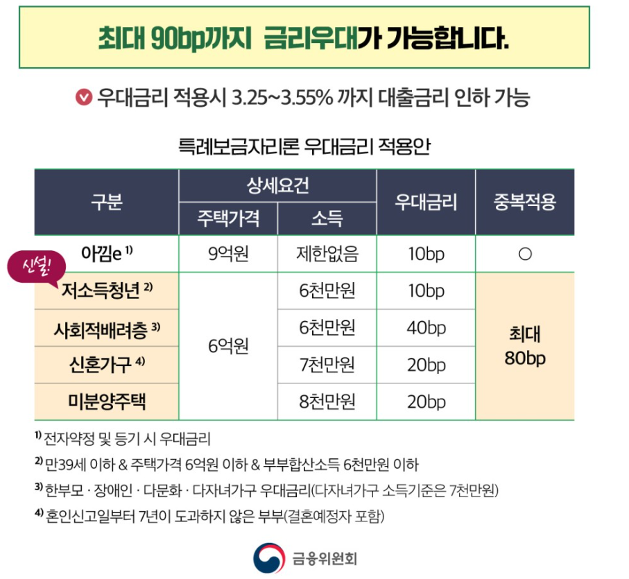 ▷주택 가격이 6억 원 이하이고 부부 합산 소득이 1억 원 이하인 차주는 연 4.15∼4.45%(우대형)
