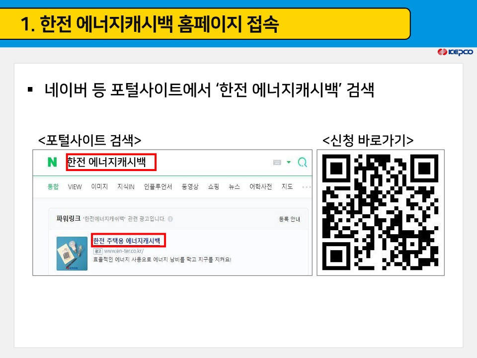 포털사이트에서 한전 에너지 캐시백을 검색하여 접속합니다.