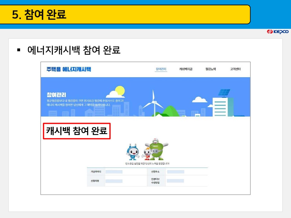 포털사이트 네이버, 구글 등에 ‘한전 에너지캐시백’ 검색 시 홈페이지로 바로 접속 가능하며, 한전 고객센터(☏123) 문의를 통해 가입경로를 문자로 받을 수 있으며 별도의 신청 기한을 두지 않으므로 연중 언제든지 신청할 수 있습니다.