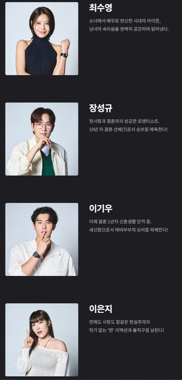 소녀시대의 취수영, 결혼 10년 차 장성규, 신혼생활 중인 이기우, 그리고 지구오락실등에서 핫한 이은지 까지 4명의 mc가 진행을 맡게 되었습니다.