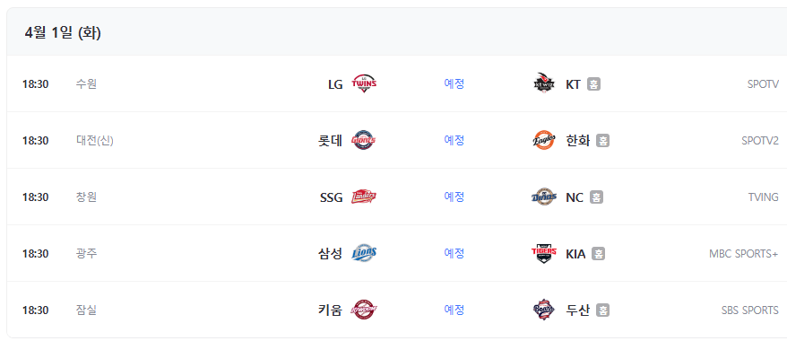 [2025 KBO 중계일정] 4월 1(화)~6(일) 경기 중계 채널 총정리! (한화, LG, 키움, KIA, 롯데, SSG, 두산, KT, NC, 삼성 중계일정) 보러가기