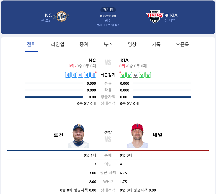 🔹 개막전 일정 : 03월 22일 토요일 14:00 광주