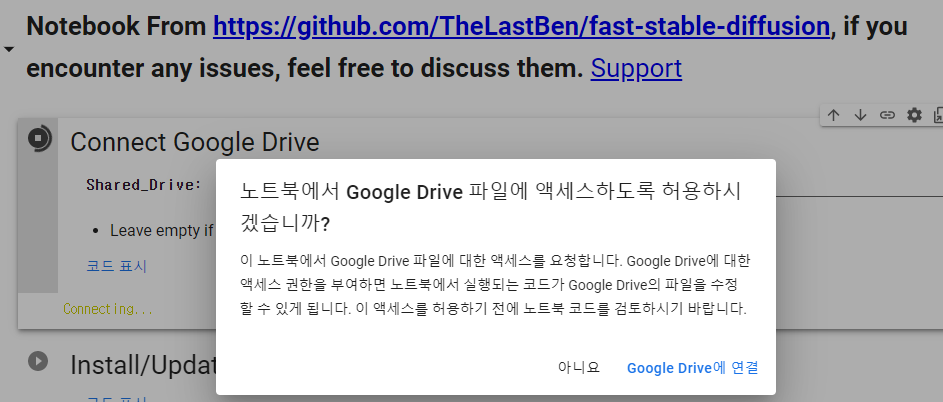 처음 버튼을 누르면 구글 드라이브에 연결 하겠냐고 물어봅니다. 연결을 실행 합니다.