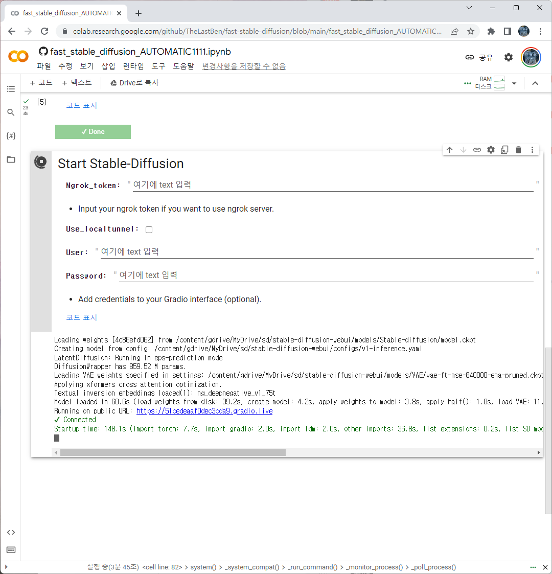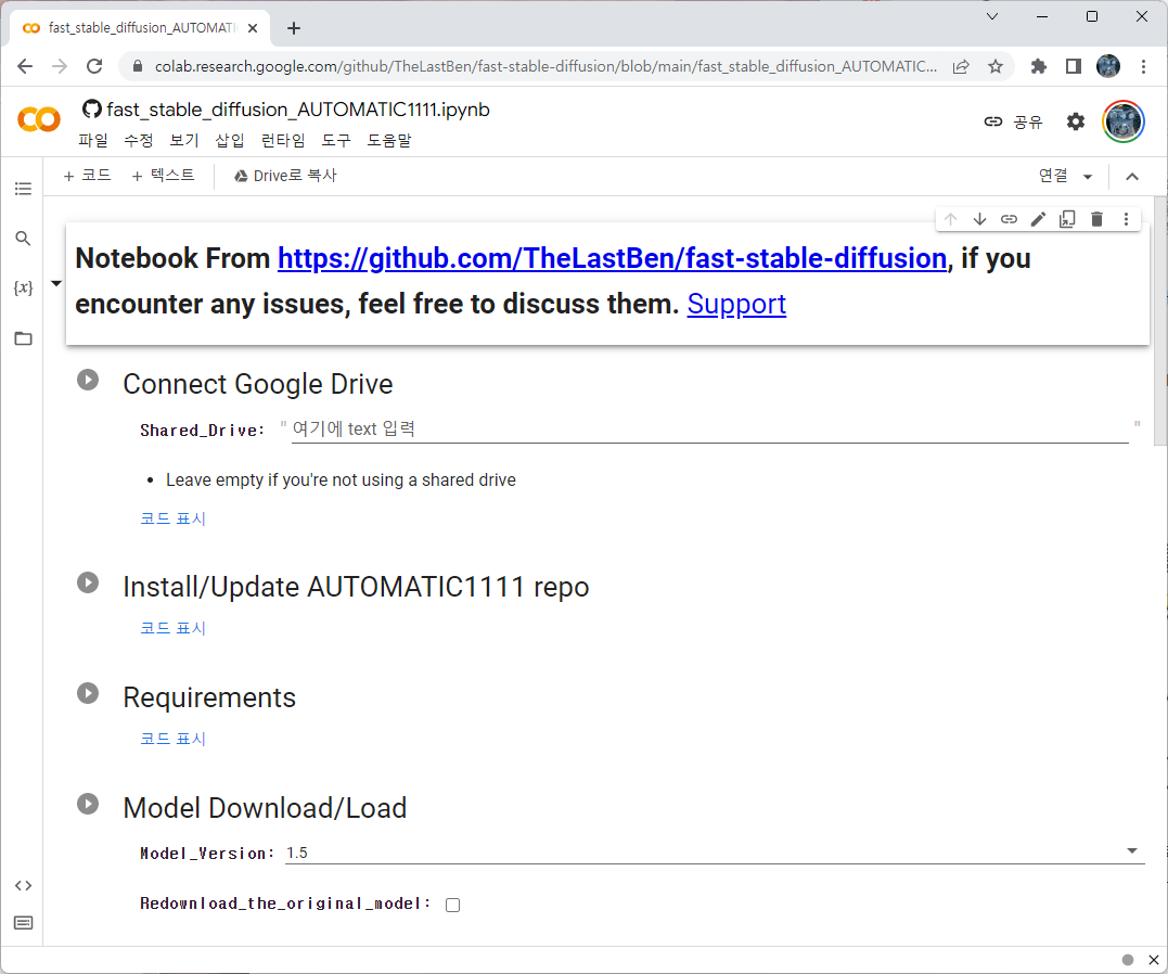 코랩 링크에 접속후 몇번의 클릭 만으로 Web UI를 실행시킬수 있습니다.