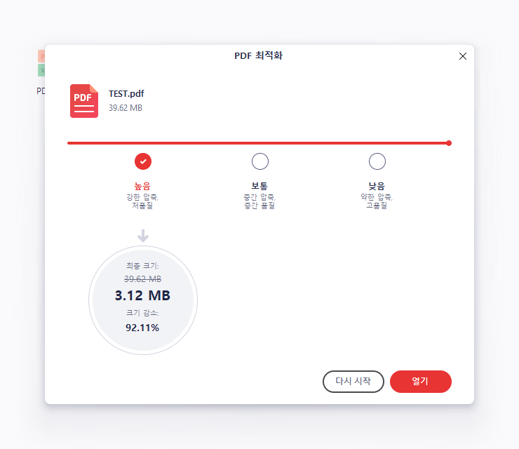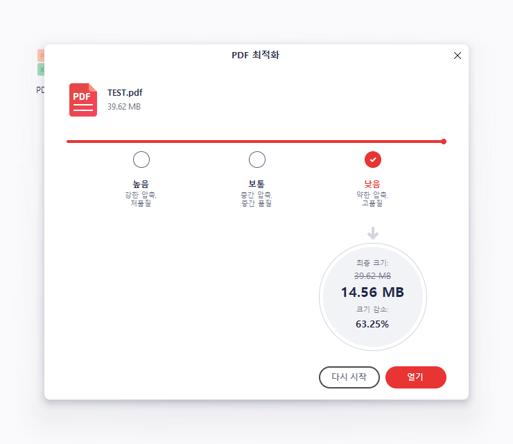 특히 사진이 많은 파일의 경우 압축률이 높을 경우 이미지의 화질 저하가 많이 발생되므로 중요한 파일이라면 보통이나 낮음을 추천드리며 이미지보단 용량이 중요할 경우 높음을 추천드립니다.