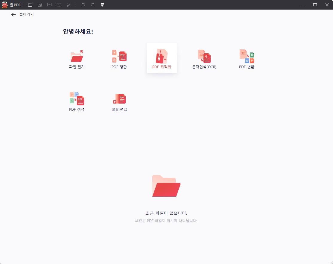 알PDF 실행 화면입니다. 실행 후 가운데 PDF 최적화 아이콘을 선택해 주면 됩니다.