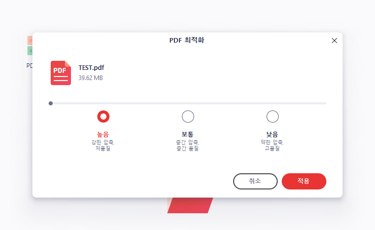 특히 사진이 많은 파일의 경우 압축률이 높을 경우 이미지의 화질 저하가 많이 발생되므로 중요한 파일이라면 보통이나 낮음을 추천드리며 이미지보단 용량이 중요할 경우 높음을 추천드립니다.